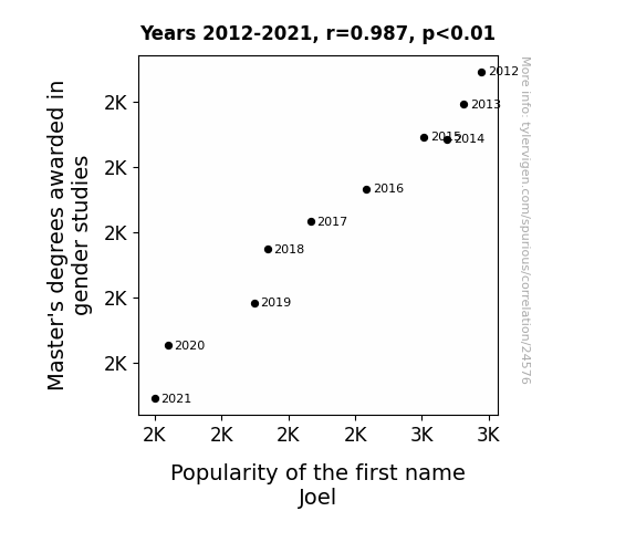 This means 97.4% of the change in the one variable (i.e., Popularity of the first name Joel) is predictable based on the change in the other (i.e., Master's degrees awarded in gender studies) over the 10 years from 2012 through 2021.