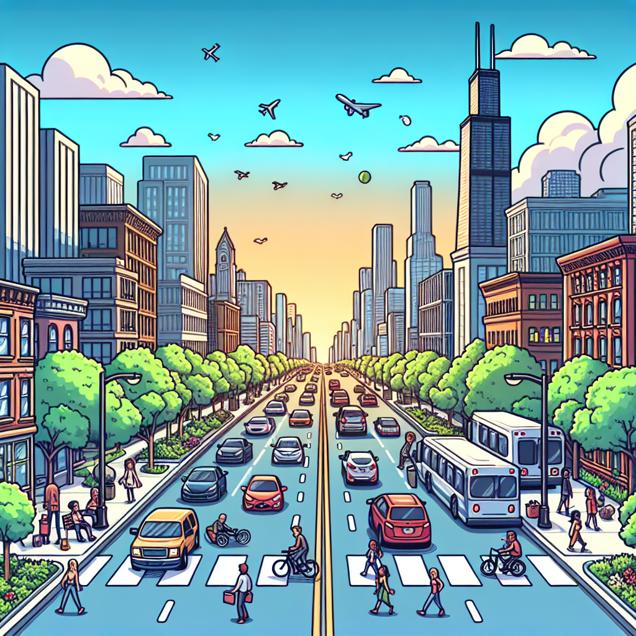 Prompt: Generate an image showing a serene Chicago street scene, with a noticeable decrease in vehicles displaying "THOMAS" license plates. The reduced traffic suggests a decline in the popularity of the name Thomas. Additionally, capture the clear and fresh air resulting from decreased pollution, depicting a cleaner skyline and a pleasant atmosphere. Emphasize the peacefulness and positive environmental impact of the reduced traffic, while incorporating a subtle touch of humor reflecting the nature of Reddit's community. The depiction should include only scenes, people, and objects, it should not include text or speech bubbles.