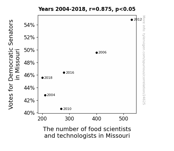 This means 76.6% of the change in the one variable (i.e., The number of food scientists and technologists in Missouri) is predictable based on the change in the other (i.e., Votes for Democratic Senators in Missouri) over the 6 years from 2004 through 2018.
