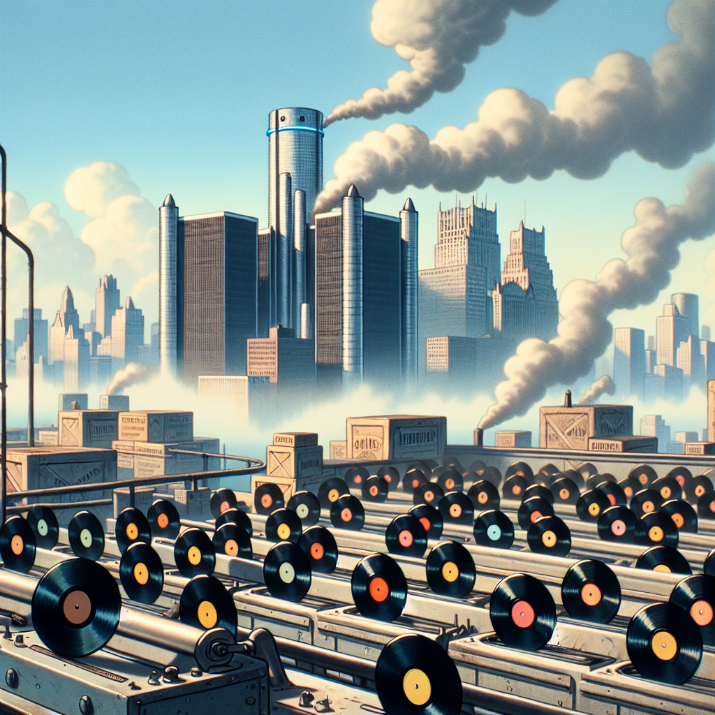 ChatGPT: In a clean and clear Detroit skyline, rows of vinyl records sit on a production line, looking wistfully at the city's now-smog-free sky. The shipment crates of albums, usually ready for distribution, are noticeably lacking as the records opt to stay put, content to spin on turntables, basking in memories of their smog-coated past.