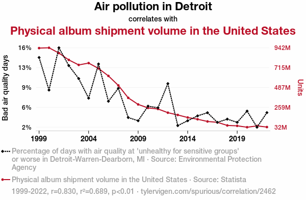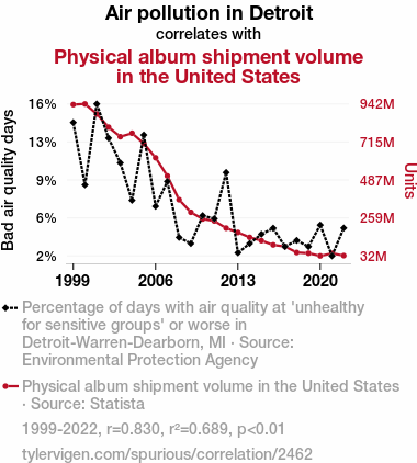 air pollution, Detroit, physical music albums, shipment volume, United States, correlation coefficient, environmental degradation, consumer behavior, Environmental Protection Agency, Statista, melodic repercussions