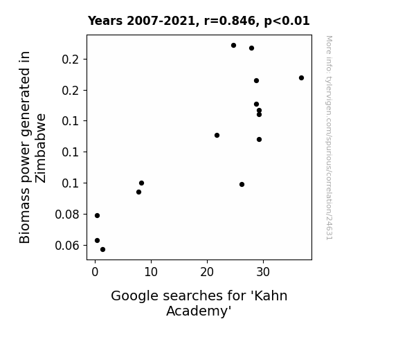 This means 71.6% of the change in the one variable (i.e., Google searches for 'Kahn Academy') is predictable based on the change in the other (i.e., Biomass power generated in Zimbabwe) over the 15 years from 2007 through 2021.