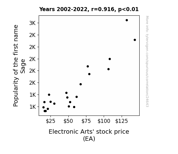 This means 84% of the change in the one variable (i.e., Electronic Arts' stock price (EA)) is predictable based on the change in the other (i.e., Popularity of the first name Sage) over the 21 years from 2002 through 2022.
