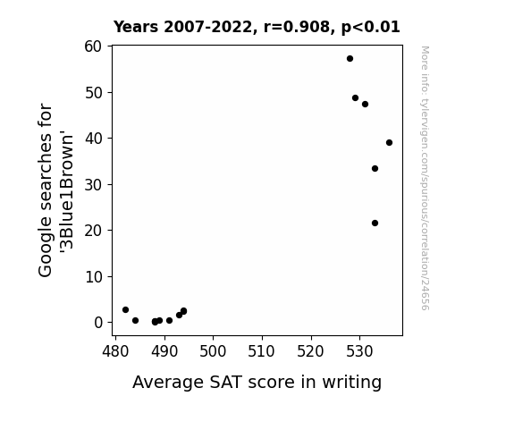This means 82.5% of the change in the one variable (i.e., Average SAT score in writing) is predictable based on the change in the other (i.e., Google searches for '3Blue1Brown') over the 16 years from 2007 through 2022.