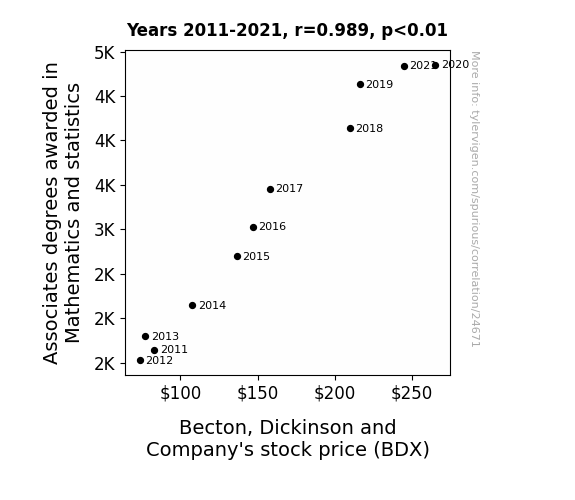 This means 97.8% of the change in the one variable (i.e., Becton, Dickinson and Company's stock price (BDX)) is predictable based on the change in the other (i.e., Associates degrees awarded in Mathematics and statistics) over the 11 years from 2011 through 2021.