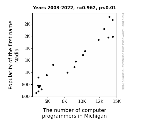 This means 92.5% of the change in the one variable (i.e., The number of computer programmers in Michigan) is predictable based on the change in the other (i.e., Popularity of the first name Nadia) over the 20 years from 2003 through 2022.