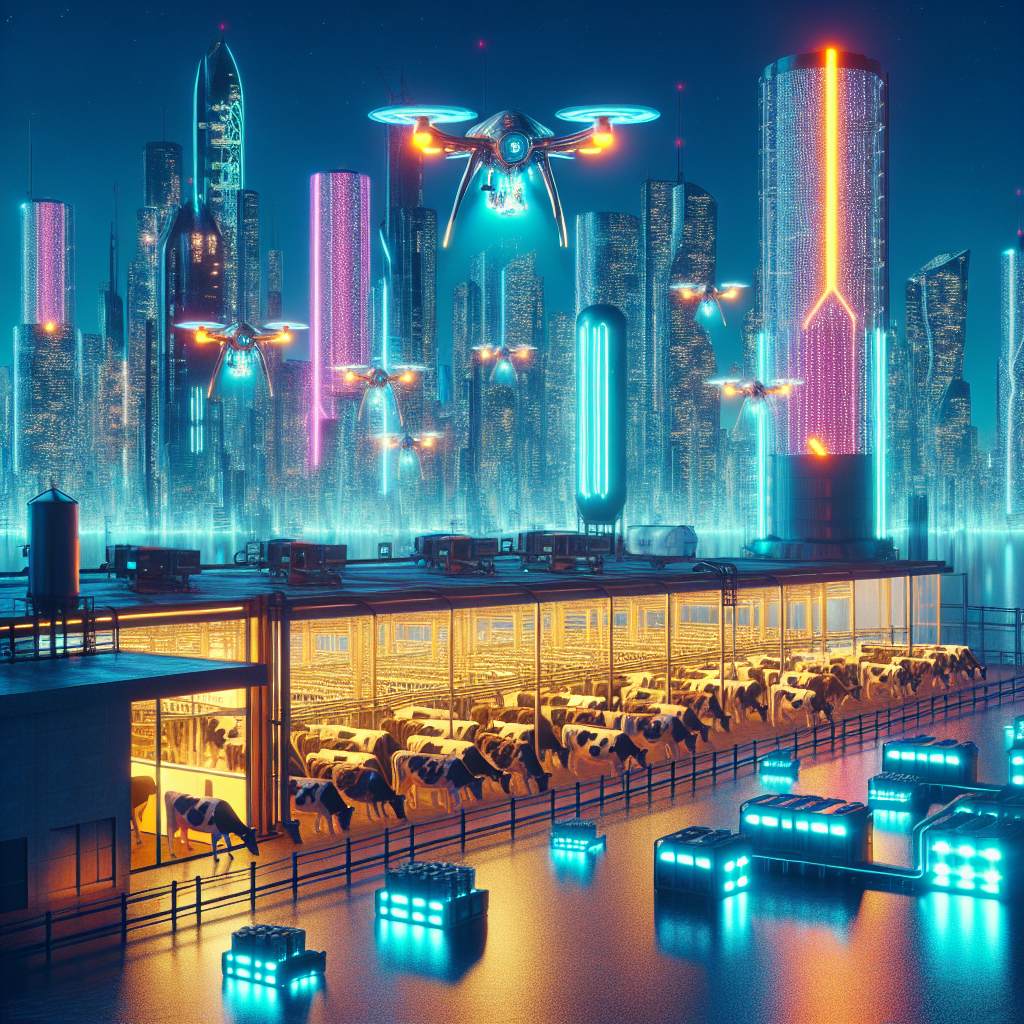 Prompt: Certainly! Here's an enhanced image generation prompt for DALL·E-3: [ Cyberpunk ] Create an image of a futuristic, neon-lit cityscape with towering skyscrapers. In the foreground, a sprawling, ultra-modern McDonald's restaurant stands out, emitting a vibrant glow. Hovering drones deliver crates of American cheese to the restaurant's loading bay, while a sleek, high-tech milking facility looms in the distance, where robotic arms gently and efficiently milk content cows grazing in a high-tech, enclosed field. The scene captures the contrast between the traditional imagery of cows grazing and the advanced, cybernetic systems in place to ensure high-quality cheese production. The overall aesthetic is a blend of natural and synthetic elements that symbolizes futuristic food production. The depiction should include only scenes, people, and objects, it should not include text or speech bubbles.