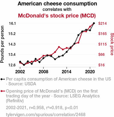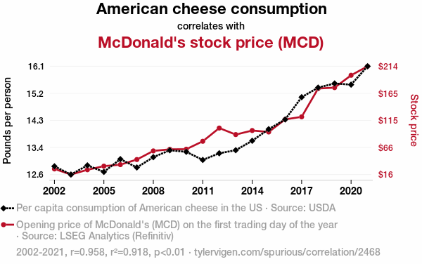 - The spurious research paper: Say Cheese: The Big Macroeconomic Impact of American Cheese Consumption on McDonald's Stock Price