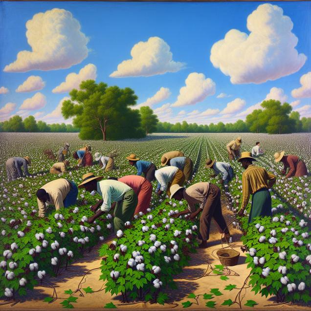 Prompt: Generate an image of a vast cotton field in Mississippi under a clear blue sky, with farmers diligently planting non-GMO cotton seeds. The vibrant green leaves of the cotton plants sway in the wind. Show people in homes and offices across the state typing "desktop background" into their Google search bars, emphasizing the connection between the decrease in diverse fabric due to the decrease in GMO cotton and the hunt for unique desktop backgrounds. Keep the visual depiction simple and realistic. The depiction should include only scenes, people, and objects, it should not include text or speech bubbles.