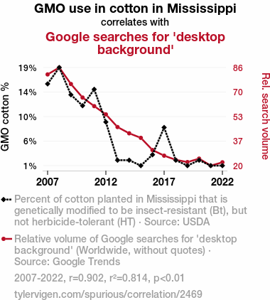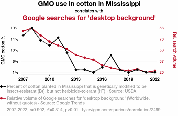 This means 81.4% of the change in the one variable (i.e., Google searches for 'desktop background') is predictable based on the change in the other (i.e., GMO use in cotton in Mississippi) over the 16 years from 2007 through 2022.