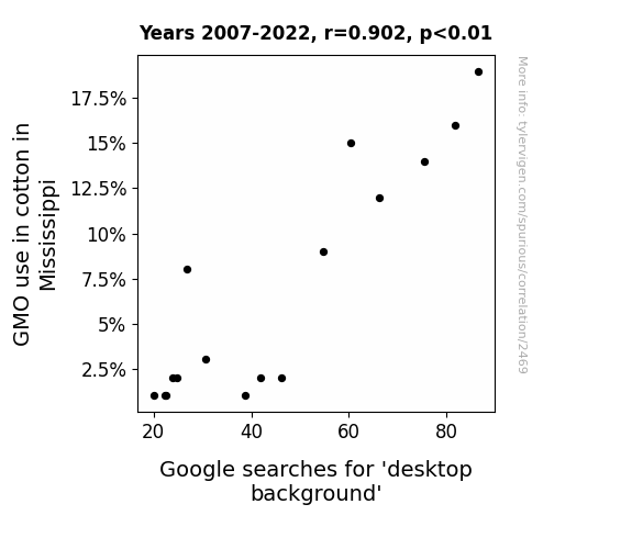 User prompt: Please provide potential search keywords for a paper titled Cotton GMO: Does It Make Your Desktop Glow? with an abstract of This study examines the unexpected and seemingly unrelated connection between the use of genetically modified organisms (GMOs) in cotton farming in Mississippi and Google searches for 'desktop background'. By leveraging data from the USDA and Google Trends, we have sought to shed light on this quirky correlation. Our findings reveal a surprisingly high correlation coefficient of 0.9024337 and a statistically significant p-value of less than 0.01 for the time period spanning from 2007 to 2022. The results suggest that there may be a peculiar relationship between the adoption of GMOs in cotton cultivation and the public's interest in sprucing up their computer screens. Join us on this journey through the cotton fields and cyber realms as we unravel this enigmatic link.