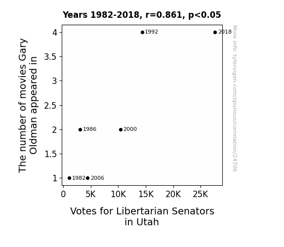 This means 74.1% of the change in the one variable (i.e., Votes for Libertarian Senators in Utah) is predictable based on the change in the other (i.e., The number of movies Gary Oldman appeared in) over the 6 years from 1982 through 2018.