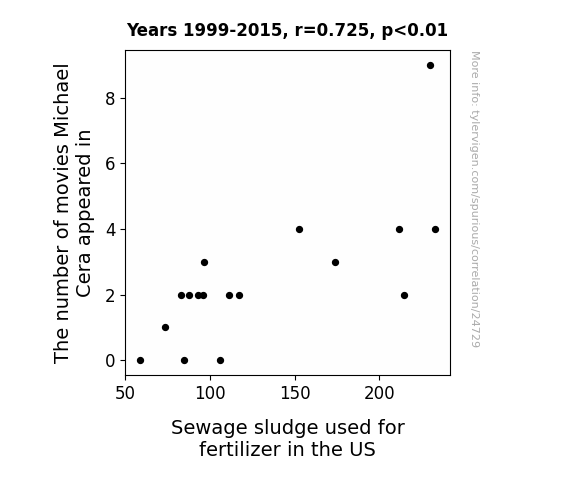 This means 52.5% of the change in the one variable (i.e., Sewage sludge used for fertilizer in the US) is predictable based on the change in the other (i.e., The number of movies Michael Cera appeared in) over the 17 years from 1999 through 2015.