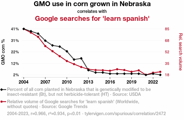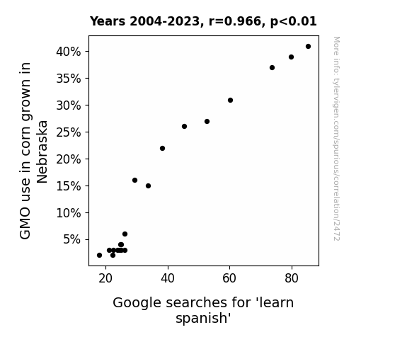 This means 93.4% of the change in the one variable (i.e., Google searches for 'learn spanish') is predictable based on the change in the other (i.e., GMO use in corn grown in Nebraska) over the 20 years from 2004 through 2023.