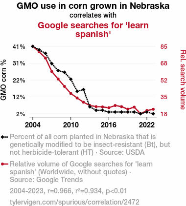 GMO, corn production, Nebraska, Google searches, learn Spanish, correlation coefficient, USDA data, Google Trends, genetic modification, language learning, interconnectedness of trends, corn and language associations