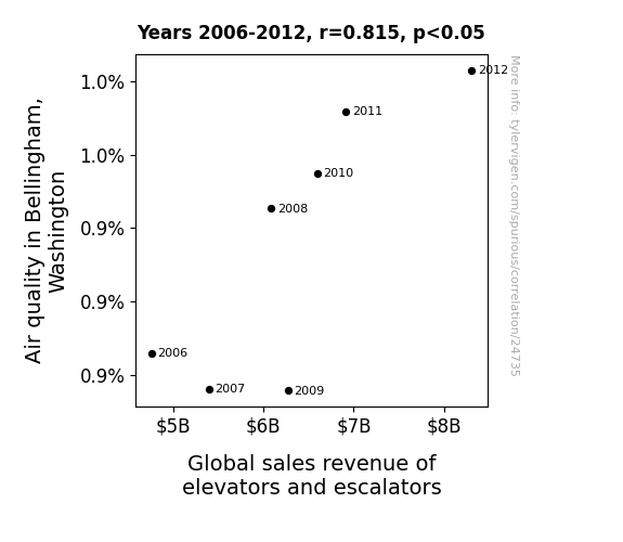 This means 66.5% of the change in the one variable (i.e., Global sales revenue of elevators and escalators) is predictable based on the change in the other (i.e., Air quality in Bellingham, Washington) over the 7 years from 2006 through 2012.