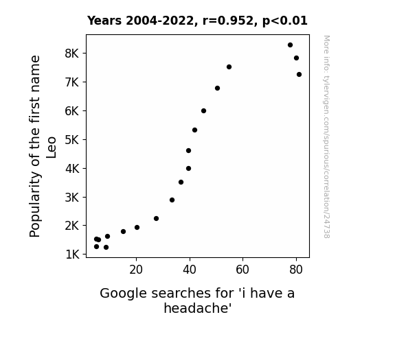 This means 90.7% of the change in the one variable (i.e., Google searches for 'i have a headache') is predictable based on the change in the other (i.e., Popularity of the first name Leo) over the 19 years from 2004 through 2022.