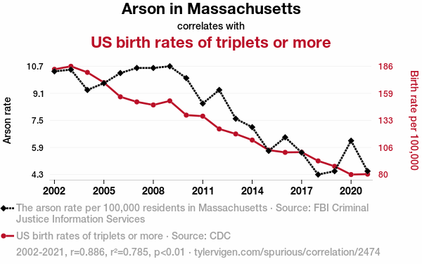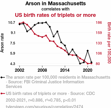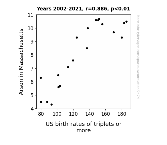 - The spurious research paper: Fanning the Flames: Exploring the Blazing Link Between Arson in Massachusetts and US Birth Rates of Triplets or More
