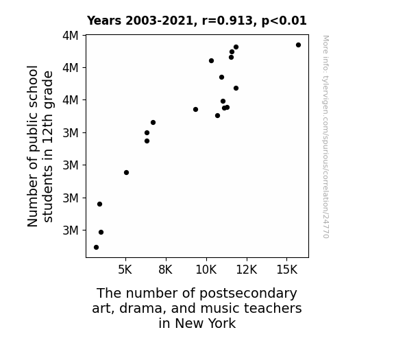 This means 83.4% of the change in the one variable (i.e., The number of postsecondary art, drama, and music teachers in New York) is predictable based on the change in the other (i.e., Number of public school students in 12th grade) over the 19 years from 2003 through 2021.