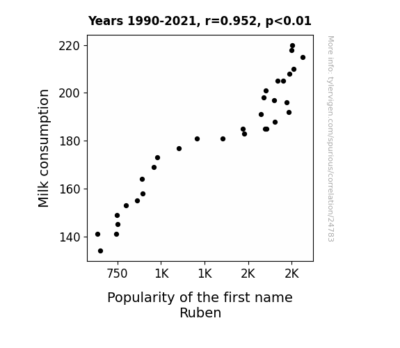 This means 90.6% of the change in the one variable (i.e., Popularity of the first name Ruben) is predictable based on the change in the other (i.e., Milk consumption) over the 32 years from 1990 through 2021.