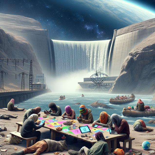 User prompt: Please describe a visual scene that prominently depicts both Hydopower energy generated in Sierra Leone and Google searches for 'i am tired', in the following situation: The surge in hydroelectricity production led to a massive spike in water-related puns, leaving people exhausted from all the "current" events!. Keep the description simple.