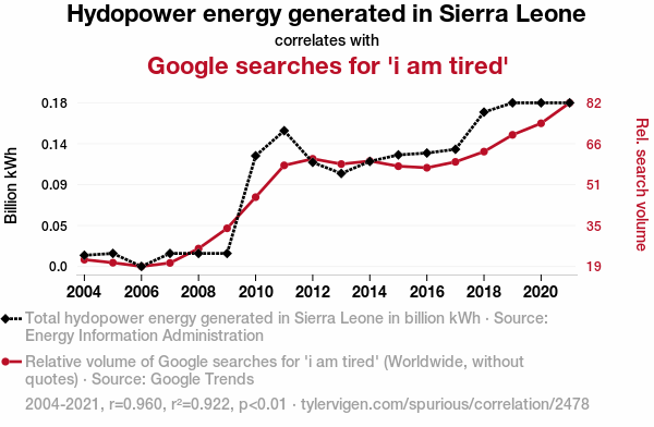 User prompt: Please provide potential search keywords for a paper titled Chronic Fatigue or Hydroelectric Brute? The Link between Hydropower in Sierra Leone and Google Searches for 'I Am Tired' with an abstract of This study explores the curious connection between the generation of hydroelectric power in Sierra Leone and the frequency of Google searches for "I Am Tired." By utilizing data from the Energy Information Administration and Google Trends, we applied rigorous statistical analysis to examine this seemingly perplexing relationship. Our findings revealed a strikingly high correlation coefficient of 0.9602440 and a p-value less than 0.01 for the period spanning from 2004 to 2021. This humorous correlation, though initially surprising, underscores the importance of considering environmental and societal influences on public sentiment. While the results do not provide a definitive answer, they do shed light on the amusing coincidences that can arise when examining unexpected connections.