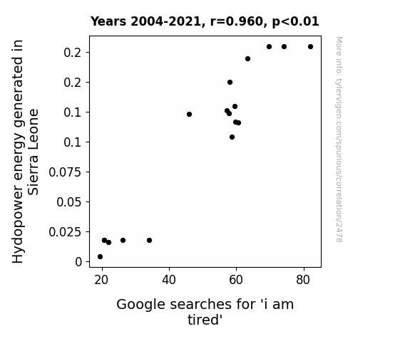 This means 92.2% of the change in the one variable (i.e., Google searches for 'i am tired') is predictable based on the change in the other (i.e., Hydopower energy generated in Sierra Leone) over the 18 years from 2004 through 2021.