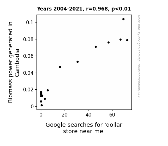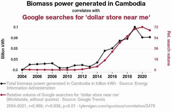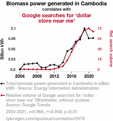 - The spurious research paper: From Biomass to Bargains: Exploring the Correlation Between Biomass Power Generation in Cambodia and Searches for 'Dollar Store Near Me'