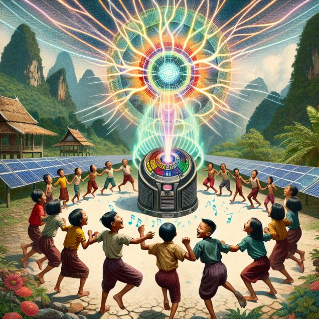 ChatGPT: Generate an image inspired by a TIME magazine cover, showing a group of children named Khalil dancing joyfully in Laos. They are encircled by solar panels, beaming with the sun's energy. In the center, a vibrant karaoke machine powered by the solar panels fills the scene with lively tunes, as the children celebrate the harnessing of solar power.