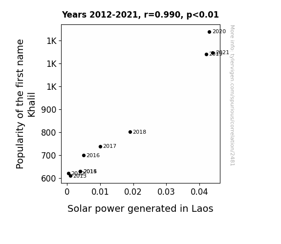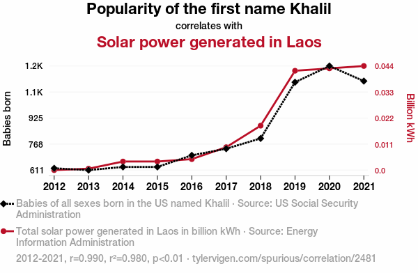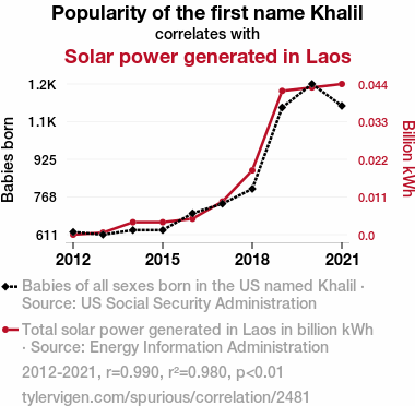 "Khalil name popularity, solar power generation, Laos, correlation coefficient, renewable energy sources, given names, US Social Security Administration, Energy Information Administration, kilowatts, nomenclature, statistical significance, mystic forces"
