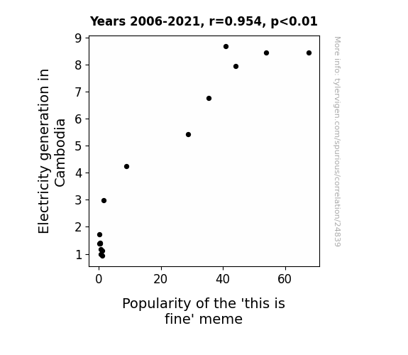 This means 91% of the change in the one variable (i.e., Popularity of the 'this is fine' meme) is predictable based on the change in the other (i.e., Electricity generation in Cambodia) over the 16 years from 2006 through 2021.