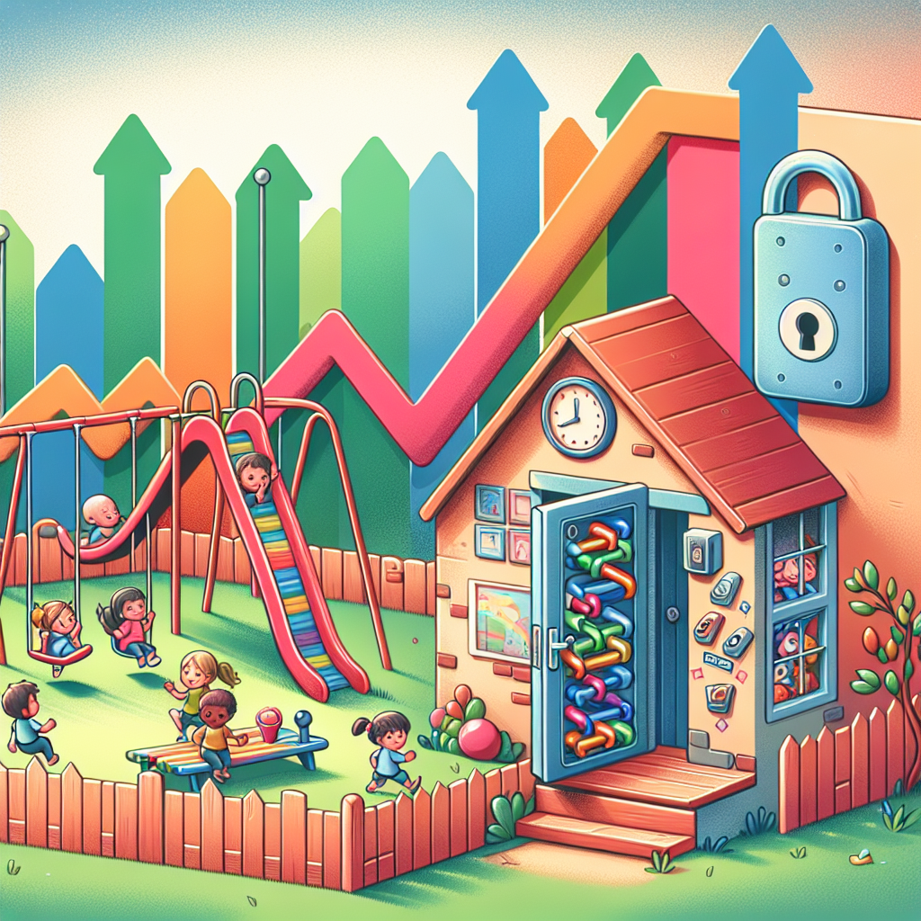 Prompt: Generate an image of a cute cartoon playground scene, with colorful play equipment and vibrant surroundings. In the background, show a decreasing number of children playing, reflecting the declining popularity of the name "Christopher." Next to the playground, depict a cute cartoonish house with an increasingly secure-looking door, symbolizing the decrease in burglaries in Oklahoma. The house should have a reassuring appearance, showcasing enhanced security features to reflect the positive decline in crime rates. The depiction should include only scenes, people, and objects, it should not include text or speech bubbles.