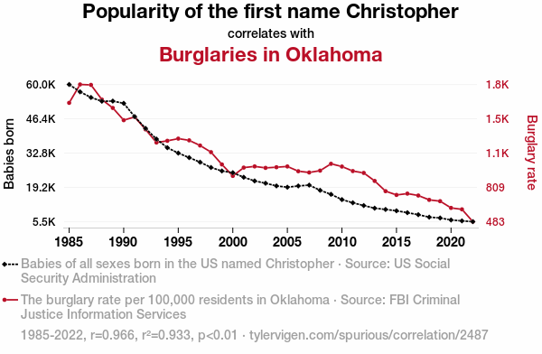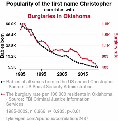 User prompt: Please provide potential search keywords for a paper titled Christopher's Popularity and Burglaries in Oklahoma: A Rhyming Analysis with an abstract of This groundbreaking study delves into the curious connection between the popularity of the first name "Christopher" and the occurrences of burglaries in the state of Oklahoma. Harnessing data from the US Social Security Administration and the FBI Criminal Justice Information Services, our research team sought to uncover whether the frequency of this moniker corresponds with burglary rates. The correlation coefficient of 0.9660686 and p < 0.01 for the years 1985 to 2022 presents an intriguing statistical relationship between the two variables.