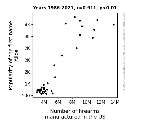 This means 83.1% of the change in the one variable (i.e., Number of firearms manufactured in the US) is predictable based on the change in the other (i.e., Popularity of the first name Alice) over the 36 years from 1986 through 2021.