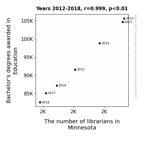 This means 99.8% of the change in the one variable (i.e., The number of librarians in Minnesota) is predictable based on the change in the other (i.e., Bachelor's degrees awarded in Education) over the 7 years from 2012 through 2018.
