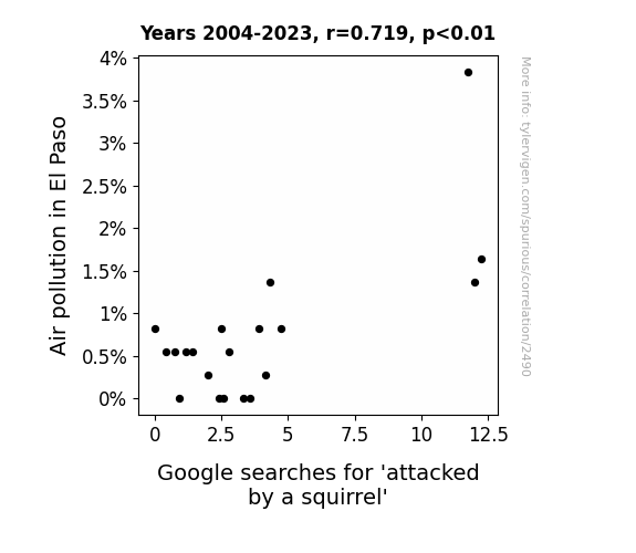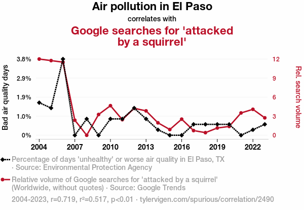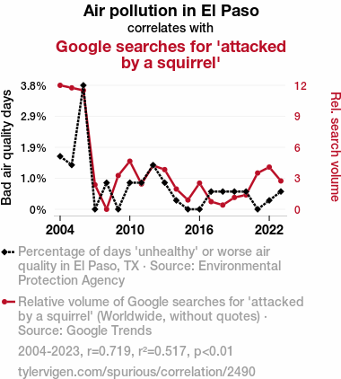 - The spurious research paper: Air Pollution in El Paso: A Nutsy Connection to Google Searches for Attacked by a Squirrel