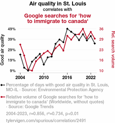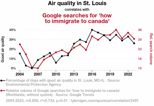 User prompt: Please make up a funny explanation for how an increase in Air quality in St. Louis caused how to immigrate to canada (Google searches for 'how to immigrate to canada') to increase. Make it feel plausible.