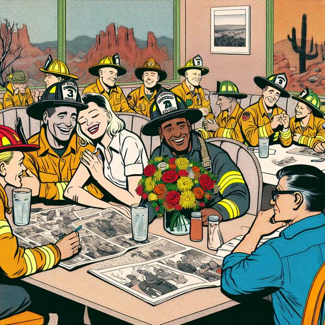 ChatGPT: Generate an image of a group of firefighters and their partners at a cozy New Mexico diner. The scene is set with muted colors and a dotted halftone pattern from the 1960s, reminiscent of a comic book illustration. The firefighters are shown smiling and chatting with their partners, conveying warmth and love. One firefighter holds a bouquet of flowers, sharing a tender moment. In the same illustration, an xkcd artist is sitting at a desk, looking at a blank canvas with a slight frown, struggling to find inspiration for their romance comics. The flames that once raged across the state are now subdued, allowing the firefighters to find solace in their relationships, while the xkcd artist seeks new sources of romantic humor.