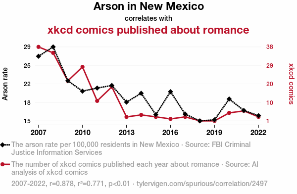 User prompt: Please provide potential search keywords for a paper titled Burning Love: Exploring the Relationship Between Arson in New Mexico and xkcd Comics on Romance with an abstract of In this study, we delve into the intriguing and yet unexplored connection between instances of arson in the state of New Mexico and the publication of xkcd comics centered around romance. As we ignited our curiosity, we utilized data from the FBI Criminal Justice Information Services and harnessed the power of AI analysis to scrutinize the comic strips from xkcd. Our findings revealed a remarkable correlation coefficient of 0.8782159 and a statistically significant p-value of < 0.01 for the years 2007 to 2022.