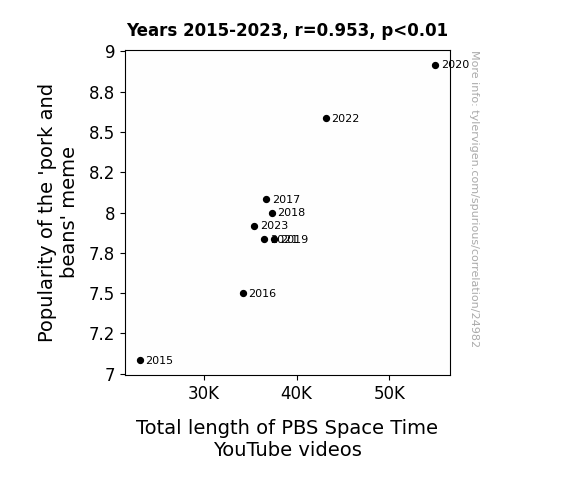 This means 90.8% of the change in the one variable (i.e., Total length of PBS Space Time YouTube videos) is predictable based on the change in the other (i.e., Popularity of the 'pork and beans' meme) over the 9 years from 2015 through 2023.