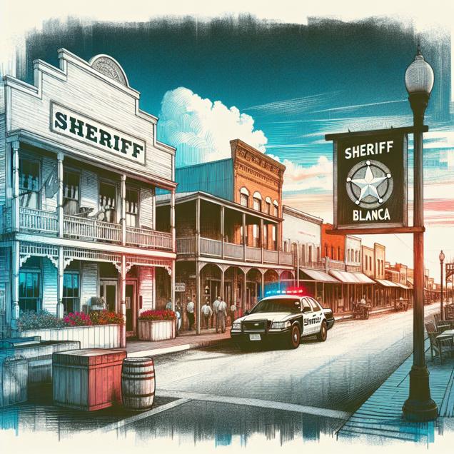 ChatGPT: Generate an image in the style of pop art depicting the charming main street in Blanco, Texas. The scene should showcase vibrant colors and bold, contrasting outlines to emphasize the bustling activity of the street. The fading name "Blanca" should be visually represented as if it's gradually being washed away, symbolizing its declining popularity. The local sheriff's office should stand proud at the forefront, displaying a dramatic decrease in crime statistics. The overall visual should capture the transformation of the town into a peaceful haven, brought about by the fading popularity of the once prevalent name.