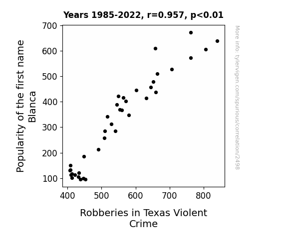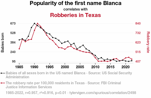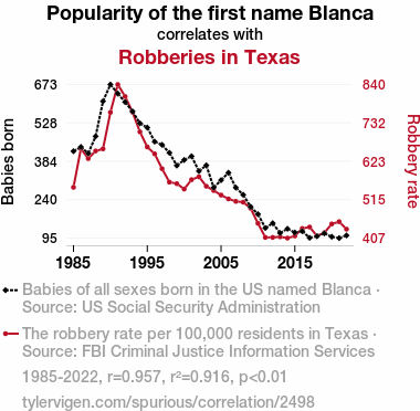 - The spurious research paper: The White Robbery: Unraveling the Correlation Between the Popularity of the Name Blanca and Robberies in Texas