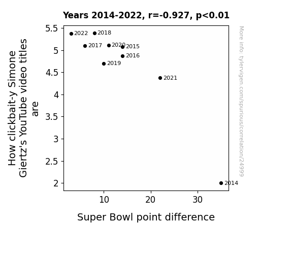 This means 85.9% of the change in the one variable (i.e., Super Bowl point difference) is predictable based on the change in the other (i.e., How clickbait-y Simone Giertz's YouTube video titles are) over the 9 years from 2014 through 2022.