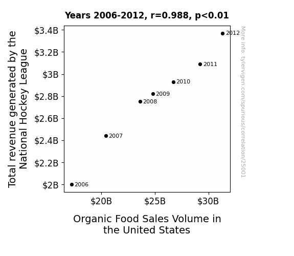 This means 97.6% of the change in the one variable (i.e., Organic Food Sales Volume in the United States) is predictable based on the change in the other (i.e., Total revenue generated by the National Hockey League) over the 7 years from 2006 through 2012.