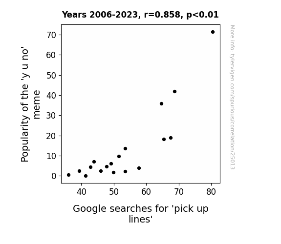 This means 73.6% of the change in the one variable (i.e., Google searches for 'pick up lines') is predictable based on the change in the other (i.e., Popularity of the 'y u no' meme) over the 18 years from 2006 through 2023.