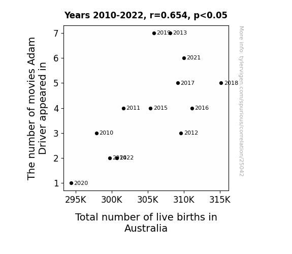 This means 42.8% of the change in the one variable (i.e., Total number of live births in Australia) is predictable based on the change in the other (i.e., The number of movies Adam Driver appeared in) over the 13 years from 2010 through 2022.
