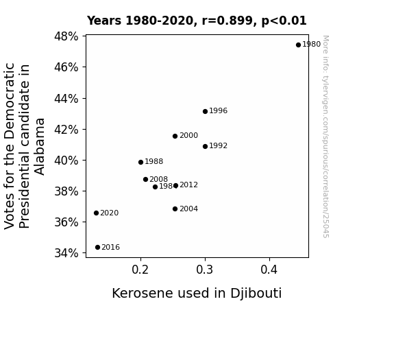 This means 80.8% of the change in the one variable (i.e., Kerosene used in Djibouti) is predictable based on the change in the other (i.e., Votes for the Democratic Presidential candidate in Alabama) over the 11 years from 1980 through 2020.