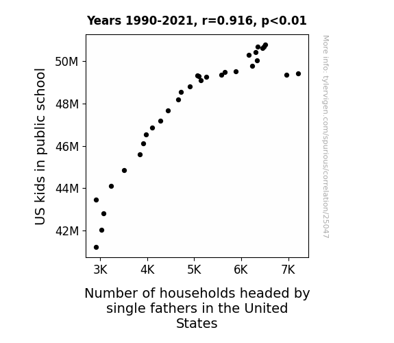 This means 84% of the change in the one variable (i.e., Number of households headed by single fathers in the United States) is predictable based on the change in the other (i.e., US kids in public school) over the 32 years from 1990 through 2021.