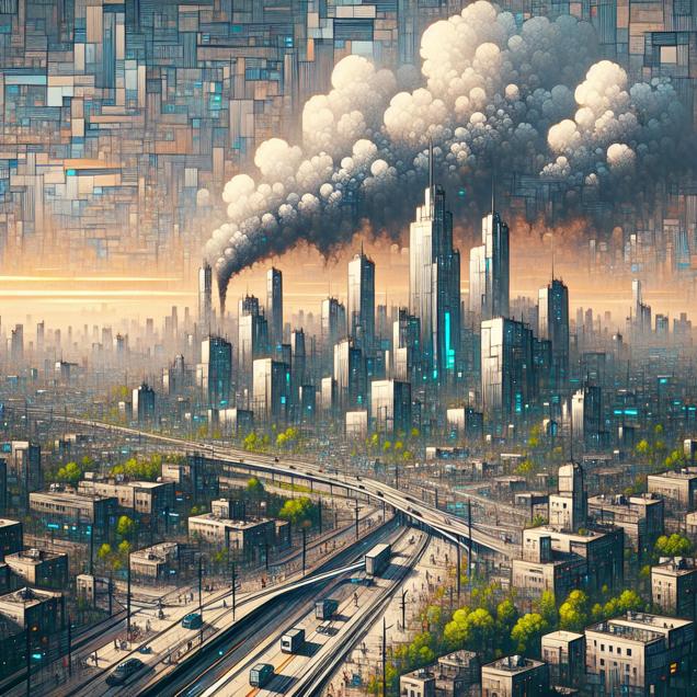 Prompt: Prompt: Using the style of "Data cyber art," generate an image of Marietta, Ohio, where the hazy fog of air pollution begins to clear, revealing a brighter shade of blue sky. Residents are depicted stepping out of their homes, taking deep breaths of the cleaner air. Local parks show people gathering for outdoor activities, with quieter streets. Additionally, illustrate television screens in households displaying a noticeable drop in viewership for Days of Our Lives as the residents embrace the fresh air instead. The depiction should include only scenes, people, and objects, it should not include text or speech bubbles.