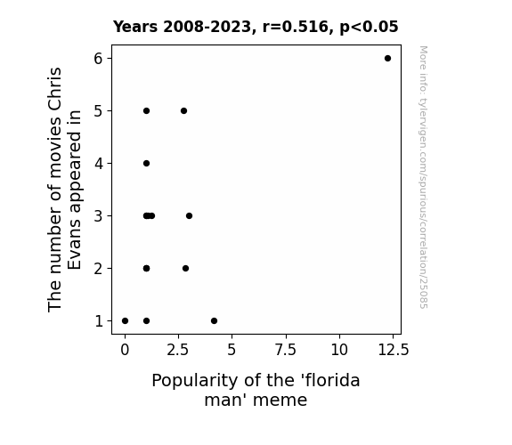 This means 26.7% of the change in the one variable (i.e., Popularity of the 'florida man' meme) is predictable based on the change in the other (i.e., The number of movies Chris Evans appeared in) over the 16 years from 2008 through 2023.